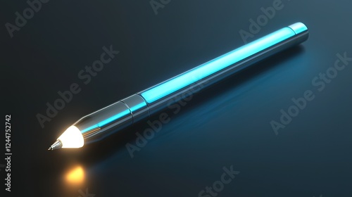 pen, writing, futuristic, glowing, light, technology, design, modern, stylish, elegant, office, business, creativity, innovation, inspiration, idea, concept, digital, art, graphic, illustration, tool, instrument, object, metallic, silver, blue, dark, background, surface, shine, glow, bright, sharp, point, nib, sleek, smooth, simple, minimal, abstract, style, future, progress, development, contraption