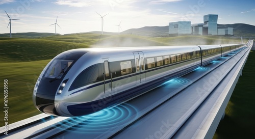 futuristic, train, transportation, technology, innovation, railway, renewable energy, city landscape, modern, urban, travel, engineering, efficiency, sustainability, environmentally friendly, design, concept, speed, power, electricity, future, automation, advanced, vehicle, infrastructure, public transport, levitation, journey
