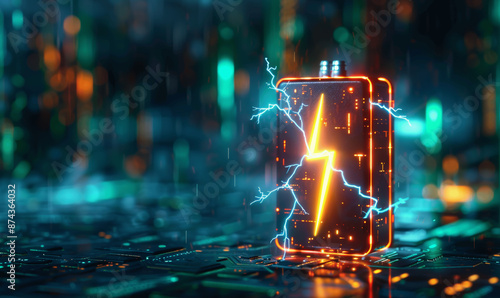 Futuristic High-Tech Battery with Glowing Lightning Icon on Dark Background, Eco-Friendly Power and Energy Technology Concept, 3D Rendering Illustration with Neon Light