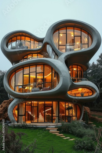 architecture, building, futuristic, house, modern, contemporary, unique, unusual, design, structure, exterior, facades, window, door, glasses, concrete, metal, wood, stone, brick, tile, roof, terrace, balcony, staircase, stair, paseo, path, entrance, garden, plant, tree, grass, lawn, sky, cloud, nature, landscape, environment, sustainability, environmentally friendly, green, home, residence, dwelling, shelter, living space, habitat