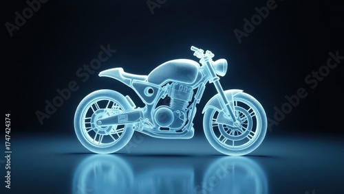 Futuristic illustration showcases a motorcycle outline rendered in a luminous, ethereal blue, positioned on a reflective surface against a deep black background, creating a sense of energy and...