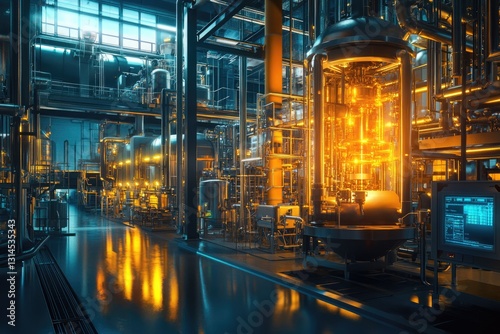 industrial, factory, interior, reactor, glasses, steel, pipe, machinery, technology, futuristic, modern, glowing, orange, blue, dark, shiny, metal, tube, equipment, process, manufacturing, production, energy, power, light, illumination, complex, intricate, system, network, clean, abstract, architecture, design, engineering, science