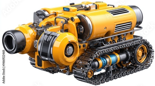 Futuristic Industrial Machine: A detailed image of a yellow, high-tech industrial machine featuring complex mechanical design, powerful structure, and rugged tread system.