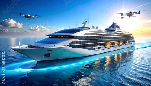 Futuristic luxury cruise ship with autonomous drones sailing on a serene ocean at sunrise, showcasing advanced travel technology.