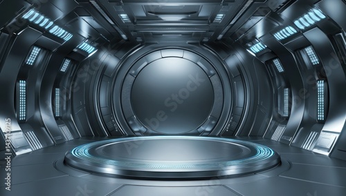 futuristic, spaceship, corridor, interior, design, metal, steel, technology, science, fiction, science fiction, modern, abstract, background, architecture, industrial, chrome, reflective, shiny, platform, circle, light, glowing, blue, dark, grey, tunnel, hallway, empty, clean, space, digital, render, three-dimensional, model, display, scene, graphic, illustration, room