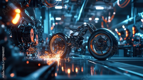 motorcycle, futuristic, vehicle, engineering, design, fabrication, spark, assembly, machine, workshop, metal, chrome, technology, automotive, custom, innovation, transportation, concept, industry, manufacturing, modern, robotic, production, speed, power, automated, machinery, mechanic, welding, electric, metallic, process, advanced, precision, efficiency, automation, transport, gear, mechanical