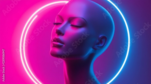 futuristic, neon, portrait, female, abstract, lighting, bald, colourful, glowing, vibrant, illuminated, surreal, modern, digital, circular, pink, blue, artistic, design, creative, mysterious, bold, conceptual, expression, cyber, elegant, sleek, smooth, atmospheric, composition, aesthetic, technology, innovation, hue, mood, visionary, fantasy, striking, aglow, radiant, spectrum, dynamic, harmony