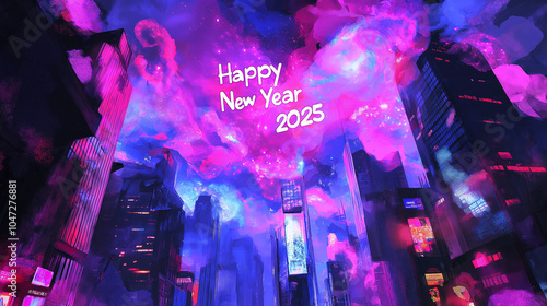 Futuristic New Year 2025 Cityscape with Neon Purple and Blue Sky Above Modern Skyscrapers