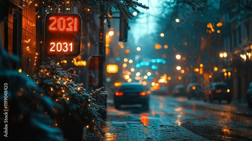 city landscape, futuristic, new year, 2031, light, decoration, snowfall, winter, street, archway, neon, vibrant, celebration, holiday, urban, modern, glowing, illuminated, festive, signs, atmosphere, aesthetic, blur, scenic, abstract, architecture, outdoors, street light, tree, downtown, display, countdown, nostalgia, visual, detail, evening, cinematic, urban life, ambience, design, sparkle, warm, cosy, wonder, magic, technology, progress, future