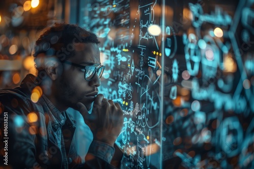 scientist, futuristic, office, technology, innovation, mathematic, research, thinking, modern, science, high technology, concentration, analysis, workspace, calculation, formula, brainstorming, digital, professional, reflective, study, experimentation, intellect, datum, education, advanced, discovery, learning, cognition, engineering, development, creativity, insight, sharpened, precision, illuminated, academic, laboratory