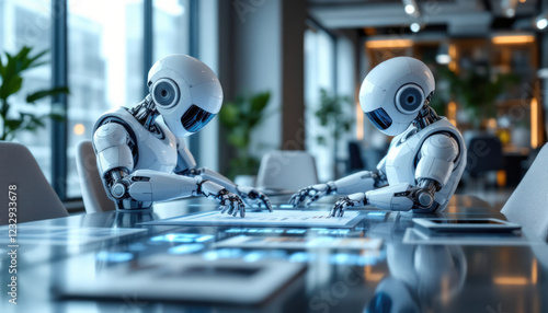 Futuristic Office: Two White Robots Collaborate on a Transparent Table