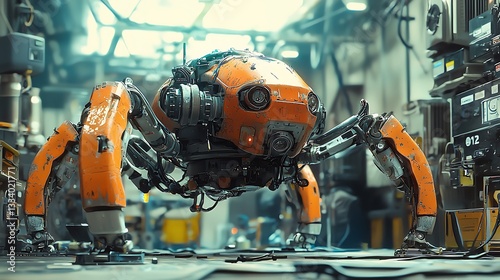 technology, art, science, concept, development, cyborg, technically, digital, leg, innovation, industrial, automation, three-dimensional, grunge, mechanism, rendering, hexapod, machine, intelligence, spider, modern, artificial, progress, arm, engineering, metallic, mechanical, futuristic, science fiction, orange, advanced, machinery, future, ai, factory, manufacturing, robotic, robot, fiction