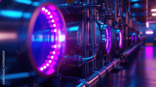 industrial, futuristic, neon, chrome, pipe, light, glowing, element, metallic, tube, machine, technology, modern, illumination, connection, infrastructure, electric, energy, power, dark, purple, blue, bright, abstract, equipment, science, science fiction, design, render, background, architecture, construction, industry, structure, metal, engineering, nobody, interior, detail, system, building, pipeline, installation, production, valva, node, circular