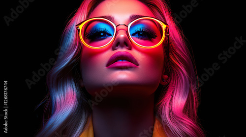 Futuristic portrait of a woman with neon glasses and vibrant makeup in dramatic lighting. Generated with AI