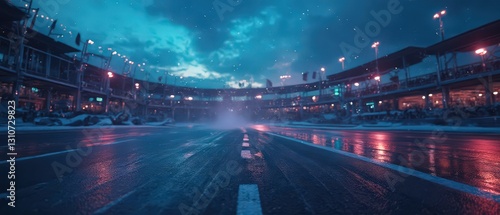 Futuristic race track with neon lights, sleek modern stadium, and reflective asphalt. Dynamic lighting, vibrant atmosphere, and high-tech architecture. Perfect for sci-fi, speed, and innovation themes