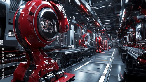 robot, red, industrial, spaceship, corridor, futuristic, technology, machinery, factory, science, fiction, science fiction, design, manufacturing, automation, engineering, metallic, dark, grey, panel, lighting, screen, digital, interface, control, system, line, row, alignment, order, clean, modern, background, illustration, rendering, three-dimensional, model, concept, tech, future, innovation