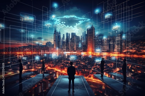 futuristic, global, datum, exchange, city, skyline, digital, technology, silhouette, network, communication, light, urban, modern, information, vision, connectivity, innovation, artificial intelligence, virtual, observation, night, landscape, scientific, holographic, architecture, cyber, neon, projection, collaboration, design, imagination, people, viewing, future, environment, tech, city landscape, multimedia, progress, insight