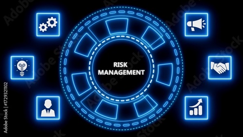 Futuristic risk management conceptual graphic featuring icons and a central circle design
