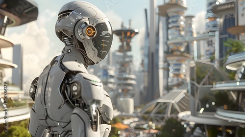 robot, futuristic, urban, high technology, landscape, city landscape, architecture, skyline, skyscraper, tower, building, transportation, hover, levitate, holographic, display, advanced, technology, innovative, modern, future, science fiction, sleek, metallic, artificial