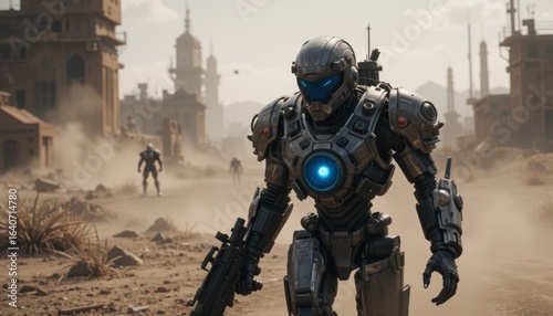 robot, futuristic, guard, ruin, desert, armed, android, cyborg, machine, armoring, grey, blue, light, tan, neutral, muted, overcast, dull, serious, determined, vigilant, protective, strong, powerful, brave, defense, security, technology, science, fiction, war, combat, threat, gritty, cinematic, dramatic, photorealistic, detailed, ai, generated, illustration, digital, art, outdoors, day, landscape, wide