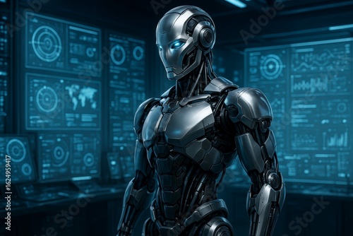 robot, futuristic, ai, android, cyborg, technology, science, fiction, machine, metal, steel, armoring, artificial, intelligence, screen, datum, glowing, interface, digital, cyber, android, automation, system, network, information, display, monitoring, control, security, surveillance, analysis, processing, integration, communication, innovation, advanced, engineering, design, prototype, future, visualisation, dashboard