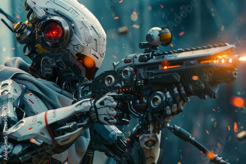 Futuristic Robot Warrior Aiming with High-Tech Weapon System in Action