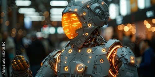 robot, futuristic, technology, orange, visor, mechanical, detail, bokeh, crowd, science fiction, innovation, artificial, intelligence, cybernetic, glowing, armoring, android, robotic, tech, machine, advanced, concept, future, engineering, neon, light, cyber, digital, industry, contraption, automated, metallic, human, android, electronic, cyberspace, smart, automation, invention, high technology, machinery