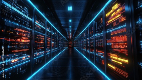 technology, server, datum, center, room, corridor, digital, futuristic, neon, light, blue, orange, glow, screen, network, information, processing, code, system, computer, cyberspace, storage, infrastructure, security, modern, innovation, abstract, background, design, science, electric, power, wire, display, panel, line, space, future, architecture, interior, style, concept, speed, progress
