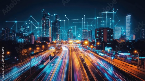 city, night, light, highway, skyscraper, technology, network, urban, modern, future, smart, connectivity, digital, metropolis, traffic, illuminated, glowing, vibrant, dynamic, fast, speed, motion, energy, progress, innovation, advancement, development, global, earth, building, street, lane, vehicle, car, transport, communication, datum, connection, infrastructure