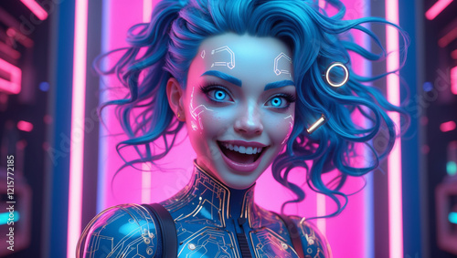 future, woman, cyber, neon, light, smile, blue, girl, technology, face, cyborg, digital, futuristic, artificial, intelligence, ai, portrait, beautiful, skin, glowing, circuit, pattern, design, interface, tech, concept, fashion, coiffure, person, make-up, cosmetic, style, human, innovation, science fiction, modern, creative, render, artwork, illustration