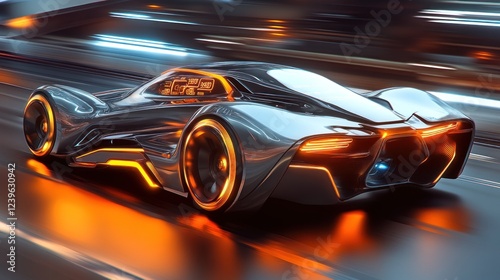futuristic, sport, car, speed, night, city, light, sleek, design, vehicle, automobile, fast, motion, blur, technology, advanced, modern, innovation, elegant, powerful, luxury, chrome, metallic, orange, glow, wheel, tire, dashboard, display, digital, interface, driving, road, asphalt, energy, electric, concept, transportation, travel, racing, dynamic, stylish