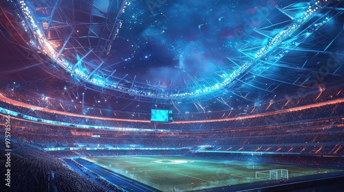 Futuristic stadium with AI-powered gameplay analysis and immersive features, enhancing the live sports experience for spectators.