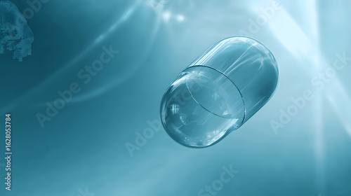Futuristic translucent capsule floating against a blue medical backdrop with light refraction.