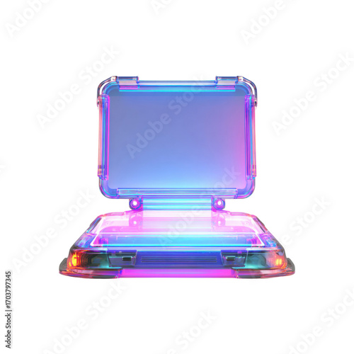 laptop, computer, technology, futuristic, neon, glowing, transparent, screen, digital, iridescent, holographic, design, modern, abstract, innovation, interface, contraption, electronic, vibrant, colourful, purple, pink, blue, light, glossy, glasses, case, open, blank, empty, background, website, app, game, cyberspace, network, datum, cyber, science fiction, surreal, artwork, illustration, graphic, visual, trend, style