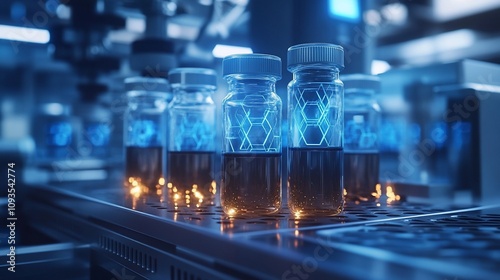 ampoule, laboratory, science, technology, futuristic, research, medicine, health care, pharmaceutical, biotechnology, manufacturing, industry, production, chemistry, innovation, development, experiment, analysis, testing, discovery, process, automation, robotic, machine, conveyer, belt, liquid, dark, blue, glow, light, energy, sterile, clean, glasses, transparent, modern, advanced, future, progress, digital, datum, network, connection