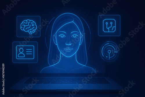 woman, laptop, digital, technology, futuristic, blue, dark, line art, interface, circuit board, brain, identity, profile, datum, network, system, security, modern, clean, elegant, abstract, glowing, software, computer, screen, innovation, artificial intelligence, biometric, verification, graphic design, icon, illustration, web, online, people, communication, cyberspace, social, media, design, symbol, concept, connection