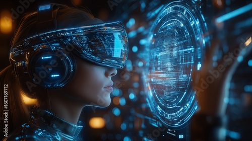Futuristic woman wearing virtual reality headset interacts with holographic interface, showcasing advanced technology and immersive digital experience