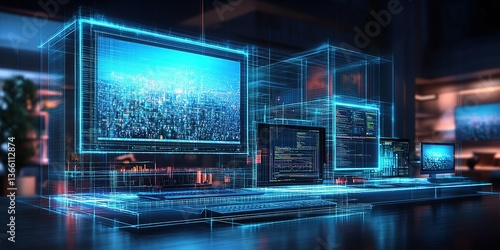 futuristic, workspace, holographic, display, computer, office, technology, modern, design, night, innovation, digital, atmosphere, creativity, datum, programming, visualisation, architecture, networking, productivity, artificial, intelligence, software, coding, electronic, led, illumination, urban, graphic, tech, environment, integration, interaction, simulation, connectivity, tool, automation, virtual, reality, cyber, aesthetic