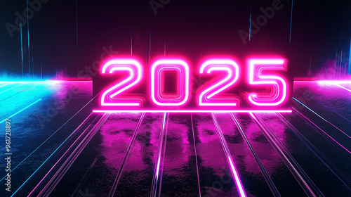 Futuristisches 2025 in leuchtendem Neon. Zukunftskonzept, digitale Ära. Dunkler Hintergrund, lebendige Farben. Tech-Ästhetik, Neujahrsmotiv. Kopierraum. abstrakt