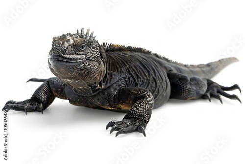 Galapagos Marine Iguana is positioned on a bright white background emphasizing its distinctive dark scales and intricate textures. The composition highlights its natural features.