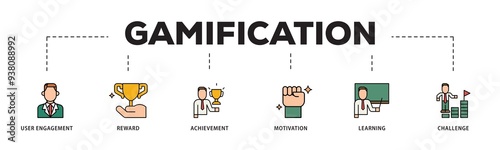 Gamification icon infographic illustration concept with icon of user engagement, reward, achievement, motivation, learning, and challenge icon png and easy to edit
