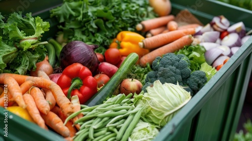 Garbage bin filled with materials that comprise green waste, such as kitchen food wastes and plant trimmings. Organic biodegradable waste container