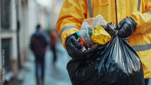 person, men at work, uniform, yellow, garbage, trash, bag, black, glove, street, city, environment, waste, management, collection, daytime, daylight, environmental, protection, safety, recycling, pollution, contamination, service, cleanup, human, individual, effort, community, responsibility, environmentalism, urban, closeup, sharpened, photo, image, people, conservation, sustainability, solution, problem, maintenance, modern, contemporary, clean, fresh, copy space, isolated
