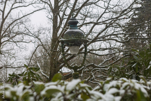 brittany, winter, bench, tree, lantern, snow, cold, park, shrub, france