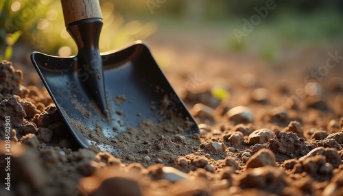 Garden shovel digging into soil under warm sunlight with blurred background