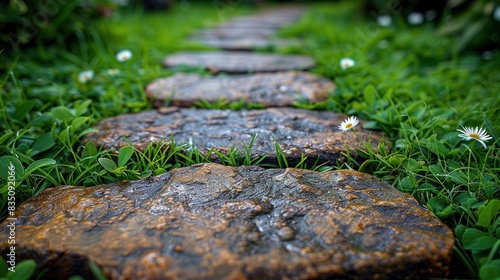 Garden stone path with grass growing up between the stones.Detail of a botanical garden.