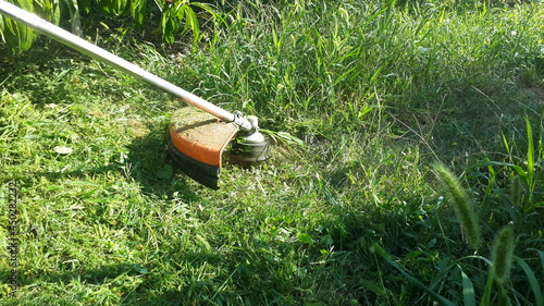 garden tools close-up. grass cutting in the garden with trimmer. weed cutting machine for working in the yard.