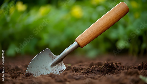 Garden trowel in rich soil, ready for planting. Spring gardening concept.