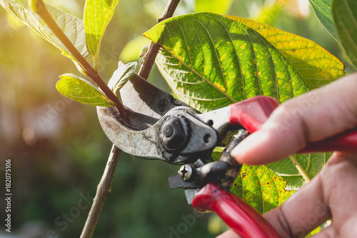 agriculture, tree branch, bush, care, currant, cut, cutter, flower, garden, gardener, gardening, glove, green, hand, hobby, holding, horizontal, leaf, man, metal, nature, people, person, plant, prune, pruning, shear, shrub, spring, tool, tree, trimming, work