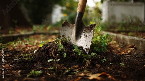 gardening, spade, dirtied, dirt, organic, plant, garden, agriculture, closeup, digging, tool, nature, brown, dark, landscaping, daytime, compost, ground, texture, metal, kitchen garden, farm, rural, grow, cultivation, plant, weed, leaf litter, autumn